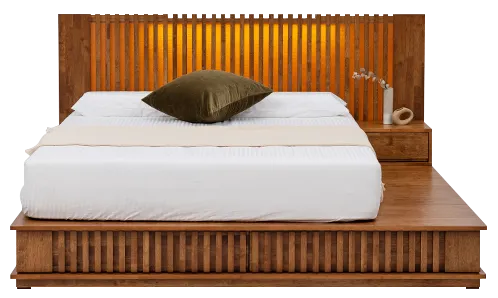 · 소재 : 국내제작 고무나무 원목+무늬목 · 색상 : 라이트브라운 · 사이즈 : Q/K, LK1700/LK1800, LK1900/LK2000 · 헤드보드 : 조명 on/off 스위치, LED조명, 콘센트 4구