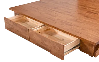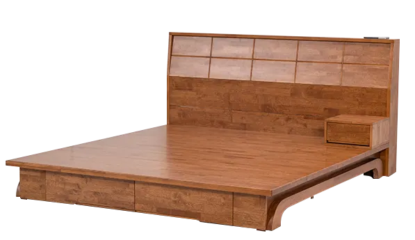 · 소재 : 국내제작 고무나무 원목 · 색상 : 라이트 브라운 · 사이즈 : Q, K, LK1700, LK1800, LK1900, LK2000(기본) · 헤드보드 디테일: ①중앙부LED 조명, on/off 스위치 ②상단부 스마트폰 무선 충전 패드, 콘센트 2구, USB포트 2구 ③분리/교체 가능 · 깔판 디테일 : ①소나무 소재 깔판 ②안정감있는 낮은 높이 · 수납공간 옵션 : ①다리쪽 서랍장 2개 ②다리쪽 서랍장 2개+협탁